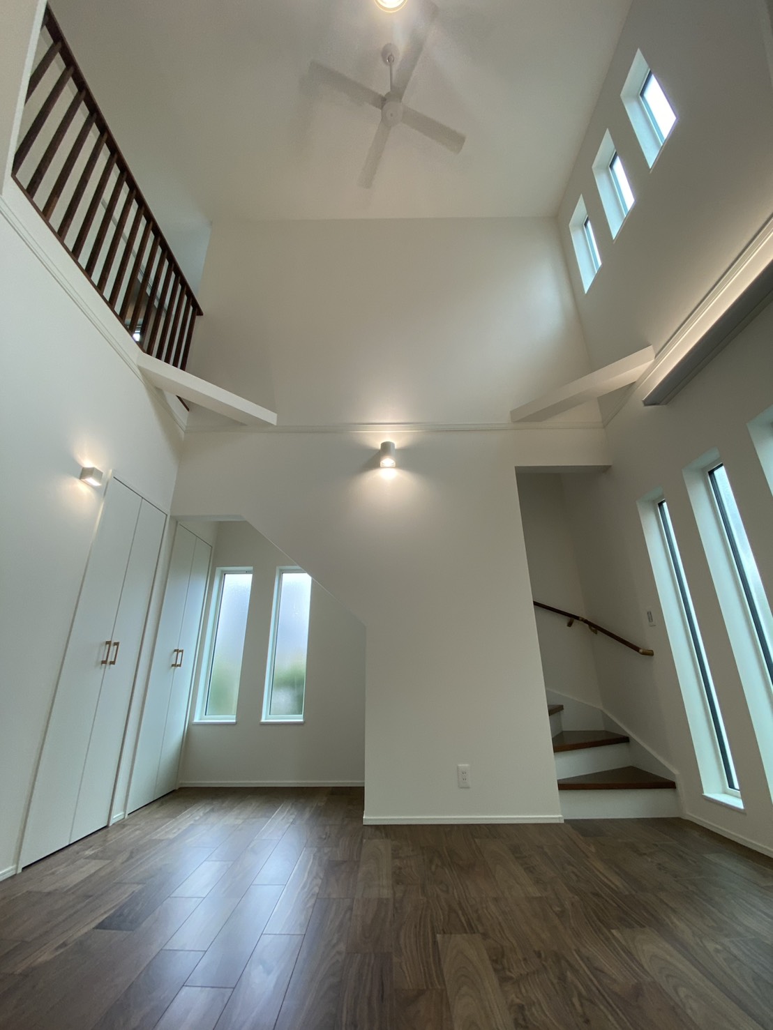 の吹き抜けを設け、やわらかな光が差し込む明るく開放的な雰囲気に。時間とともに変わる光の表情が、日々の暮らしを穏やかに彩りま