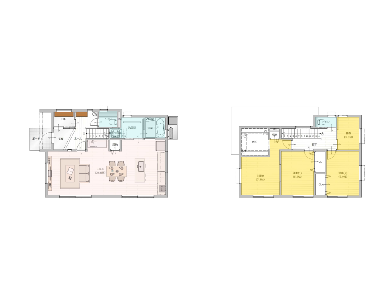 | 1階 | LDK24帖、ランドリールーム、キッチン、トイレ、SIC |