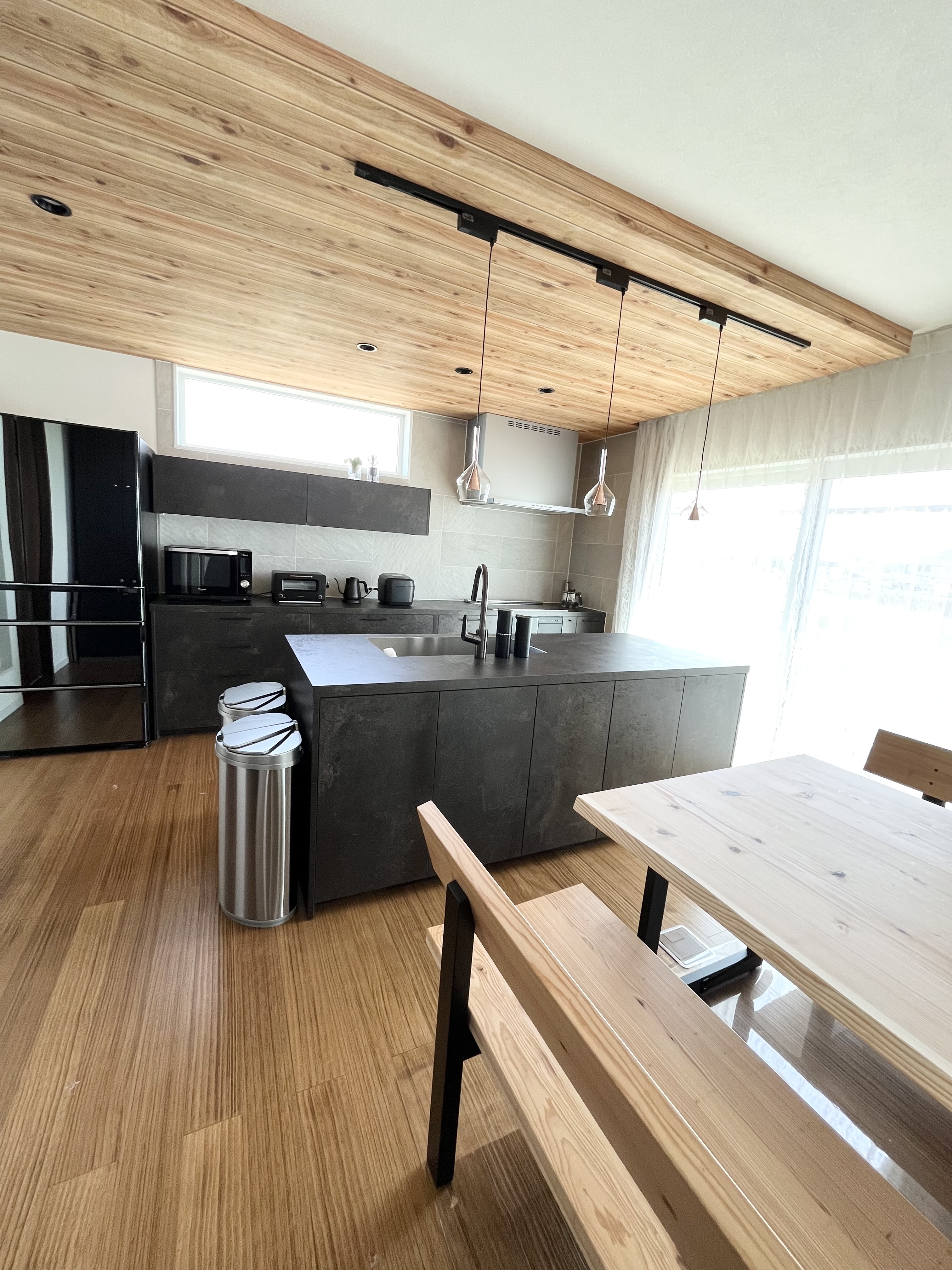 グラフテクトキッチンをメインに、木目の下がり天井と無垢床で木の温もりも残したキッチン空間。