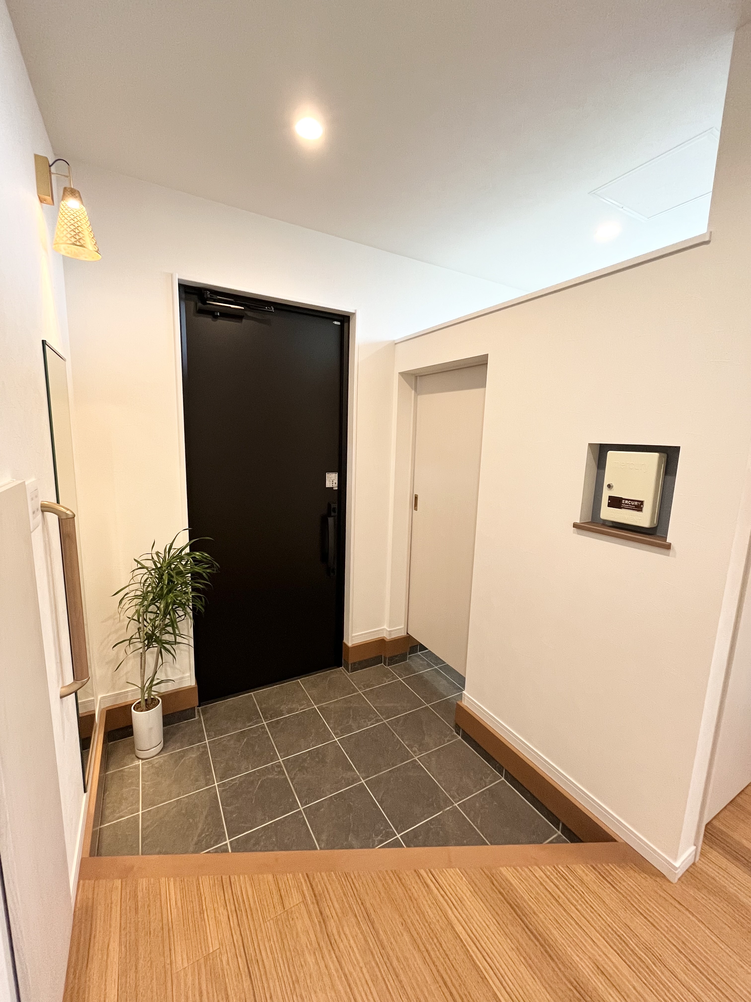 玄関入ってすぐの場所に手洗い設置。トイレドア横の為、トイレ手洗い兼用。家庭内で感染症対策としてセカンド洗面があると、とても便利。