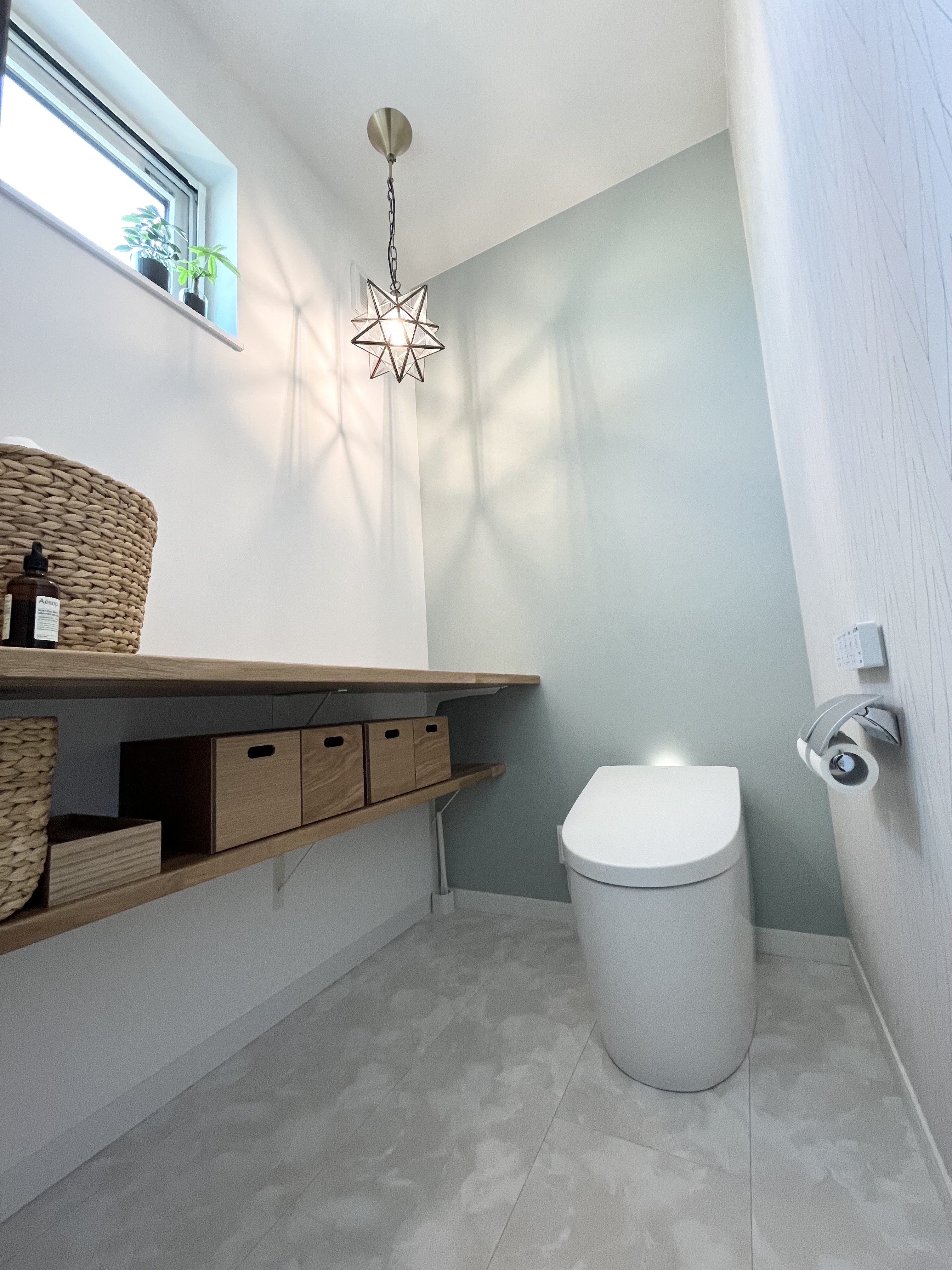1階トイレは開放感を意識して、少し広めに。北側の為、窓を入れて光を調節。