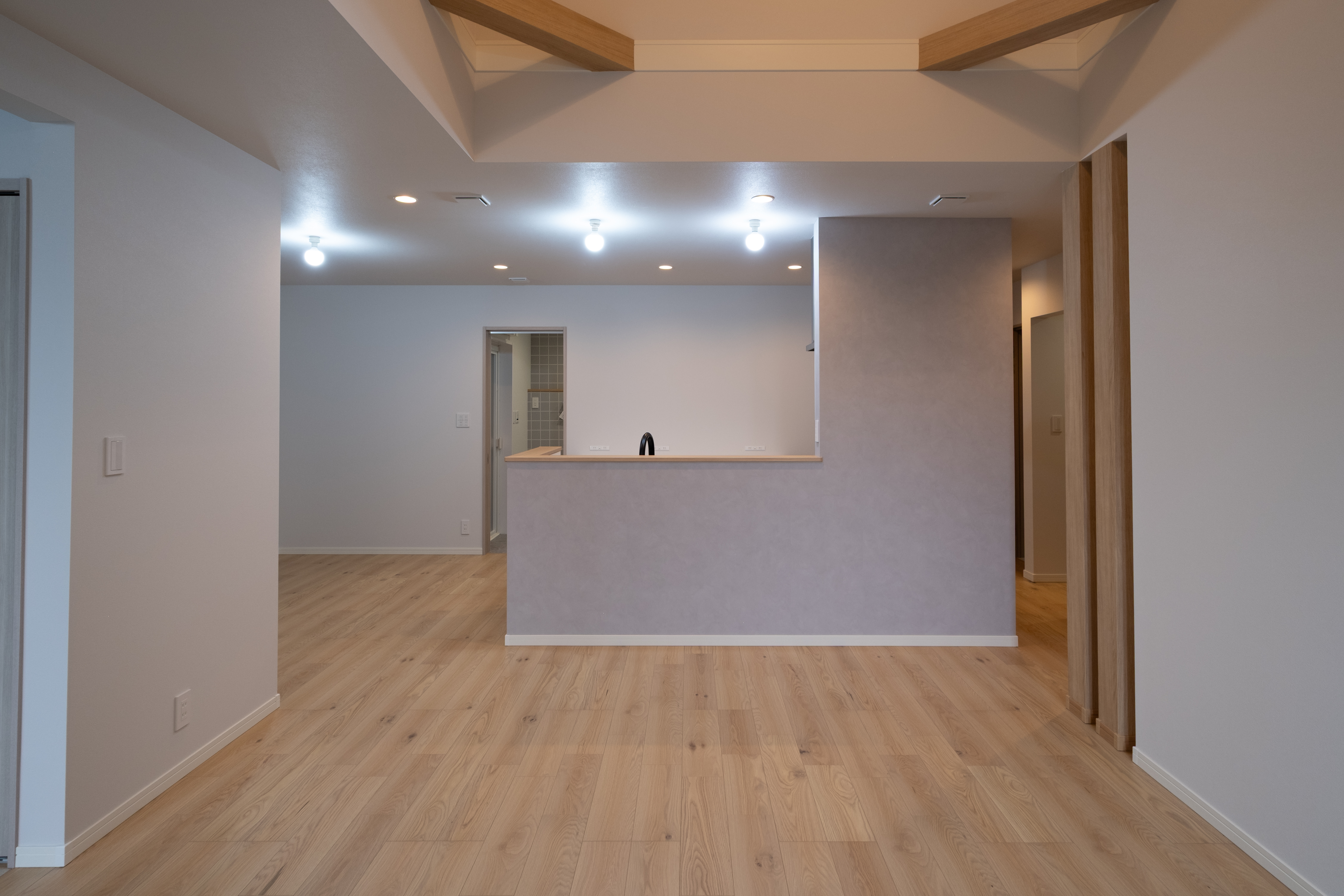 グレー×木目の落ち着いた外観デザインと、やさしい色合いのインテリアが調和し、