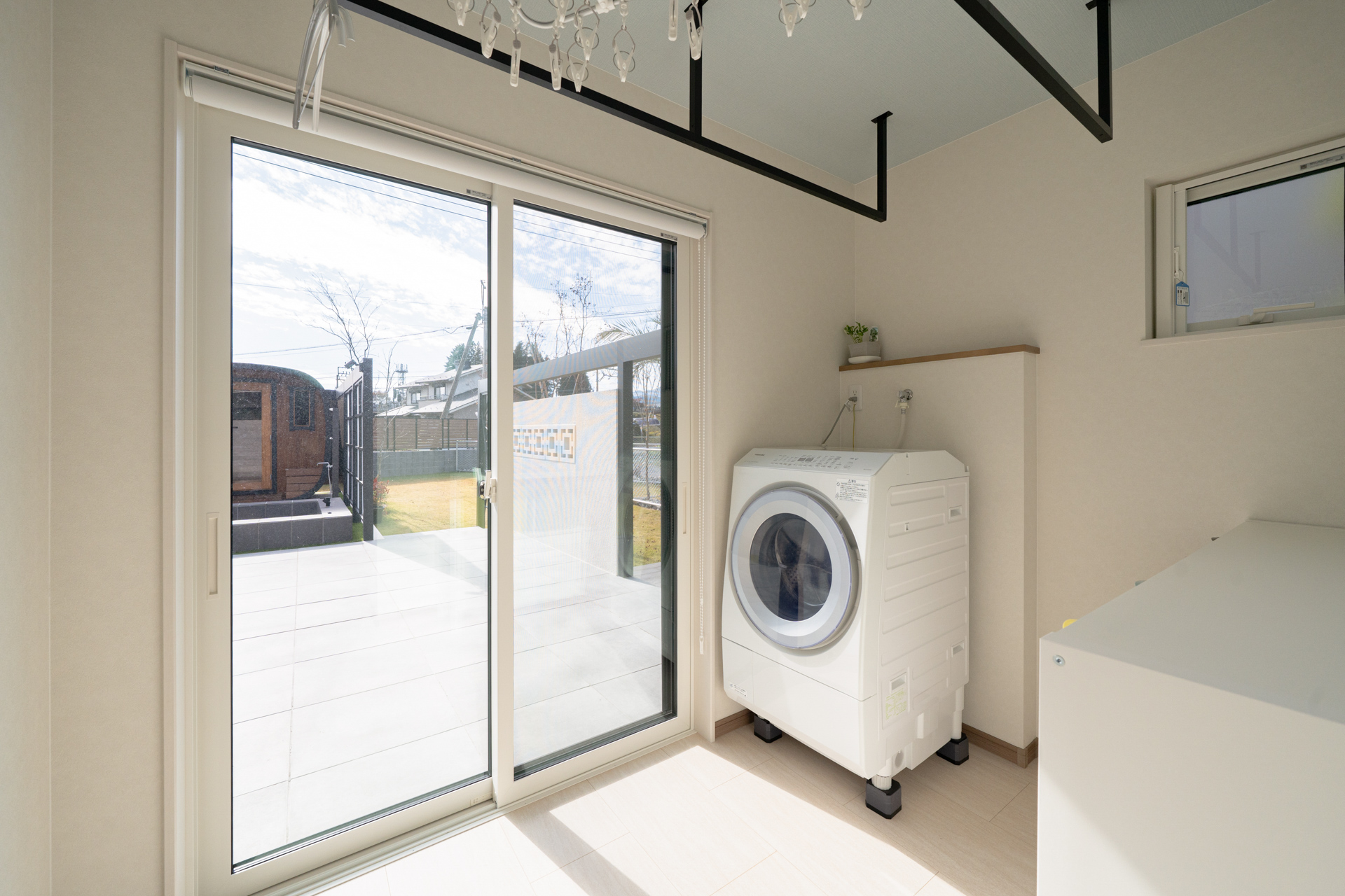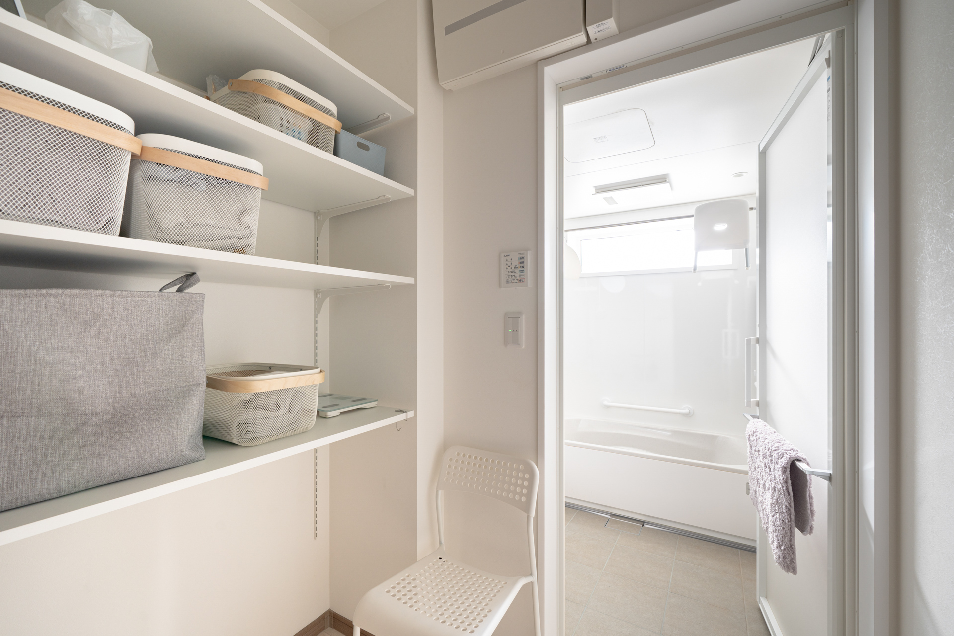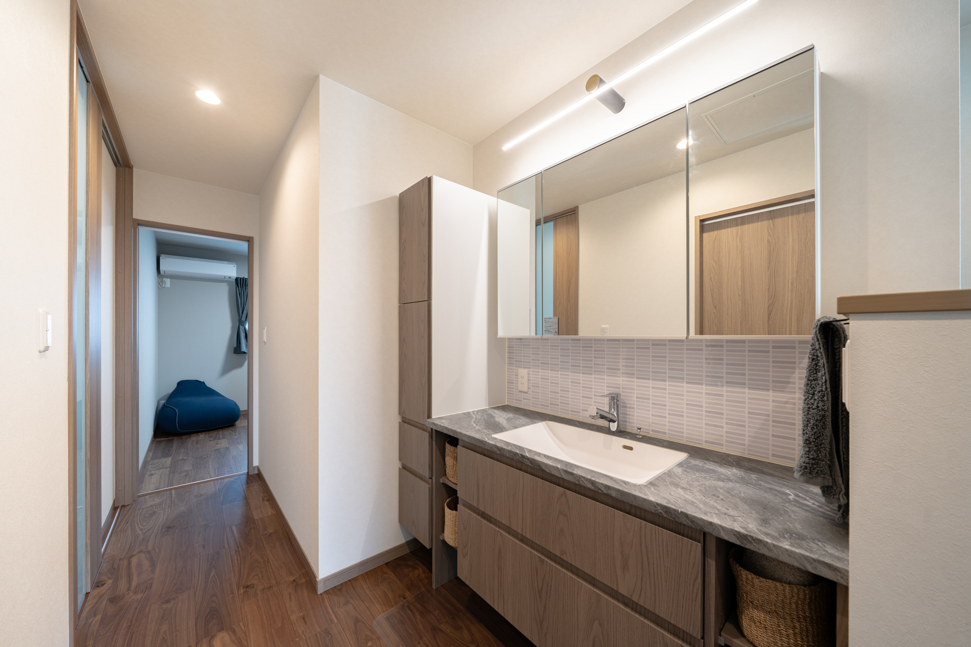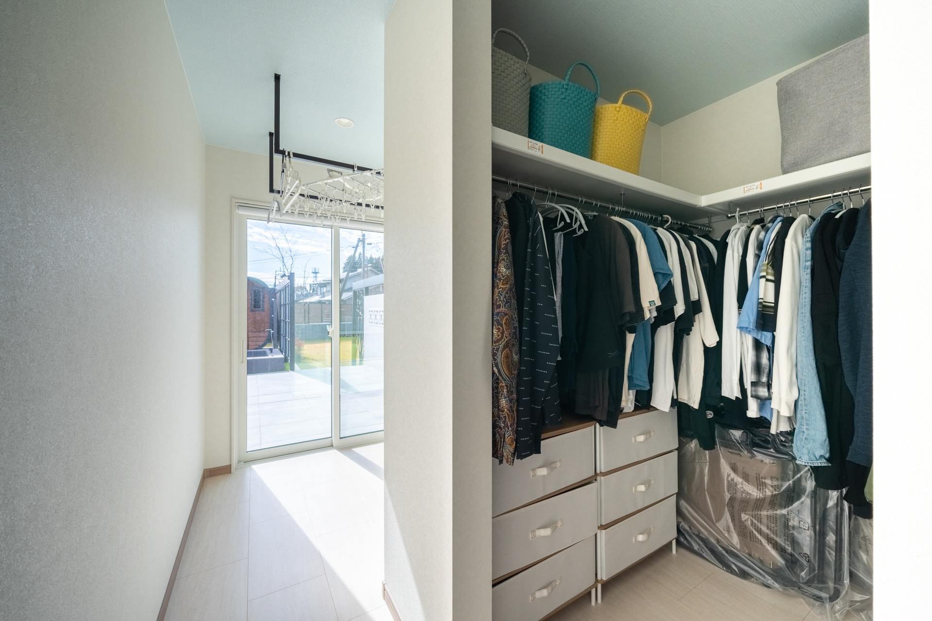 ウォークインクローゼットとランドリールームが隣接し、洗う・干す・しまうがスムーズに完結。忙しい毎日を支える使い勝手の良い家事動線が整っています。