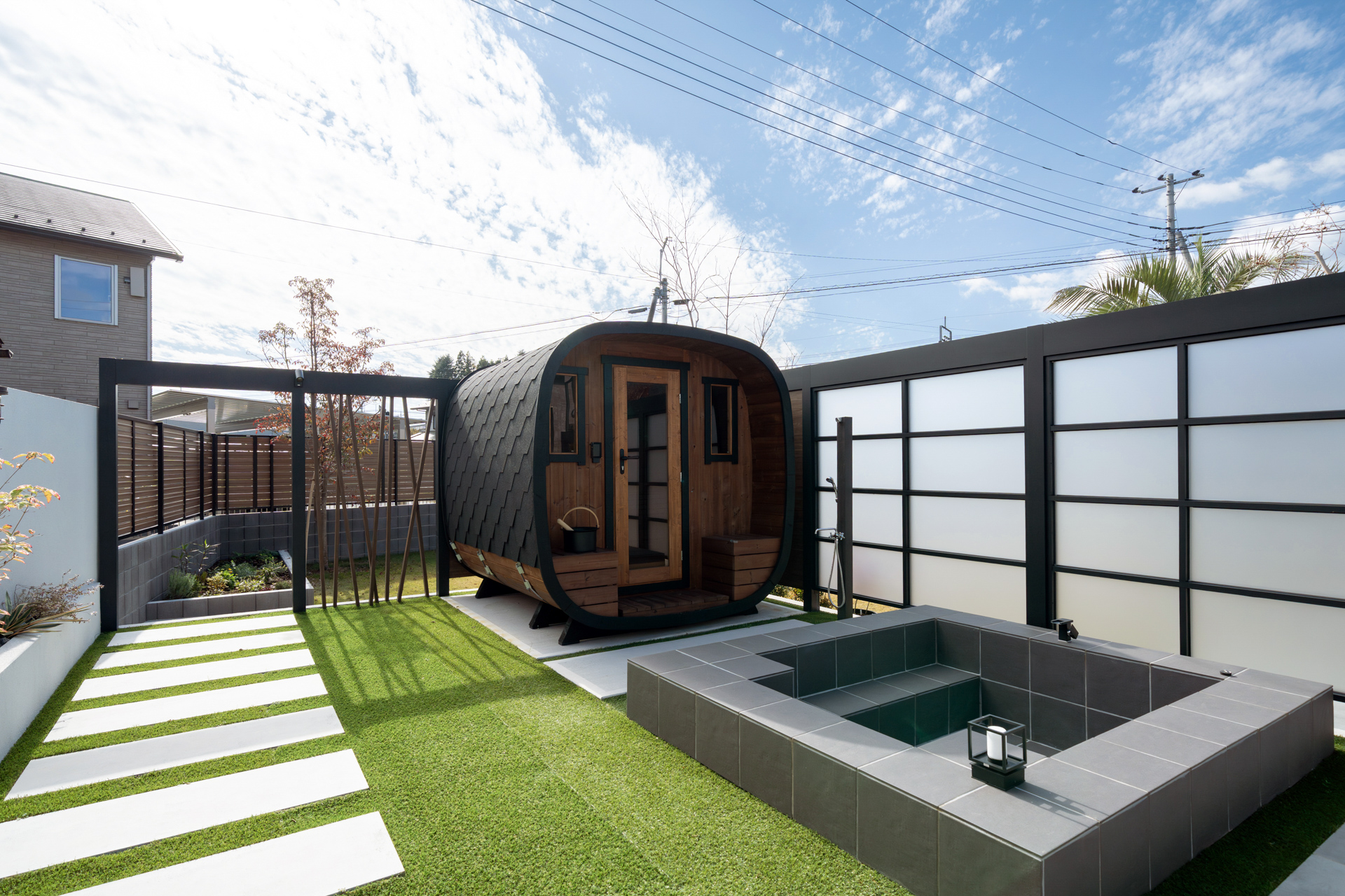 中庭に独立したサウナ小屋と水風呂を完備。外気浴スペースまで揃った、自宅とは思えない極上のリラクゼーション環境が魅力です。