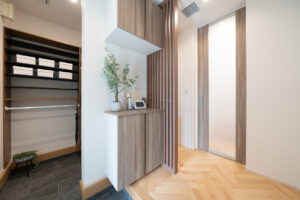 玄関ホールからも洗面室に入ることができるので帰宅後の手洗いもすぐにできて衛生的。ランドリールームにはスロップシンクも設置し、予洗い対策もバッチリです。 -
