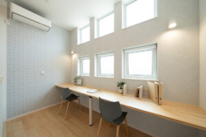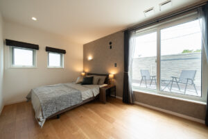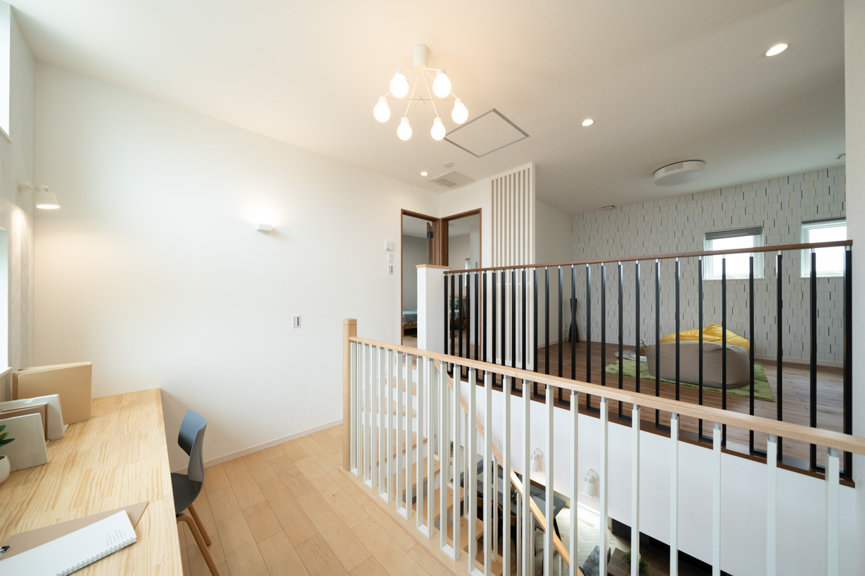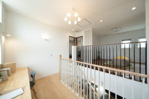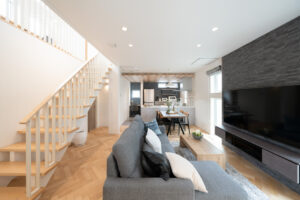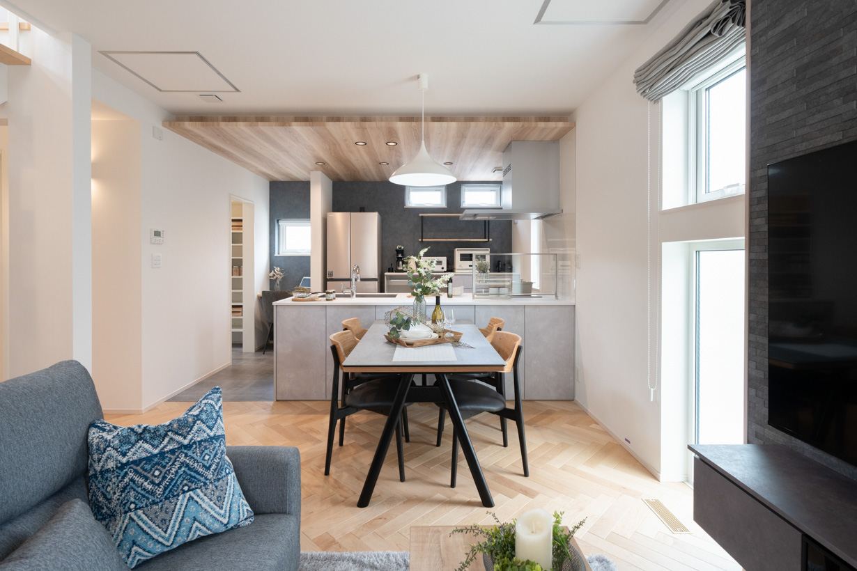 約22帖あるLDKは吹き抜けもあり広々とした空間になっているため、たくさんの友人を招いてもゆとりのある時間を過ごすことができます。リビングに大きな窓を設置したので将来的にはウッドデッキを作って外とのつながりができます。吹き抜けからはたくさんの光が降り注ぎ、LDKに入った瞬間、外部との景色の連動性によりより広い空間に感じられるお家です。