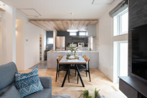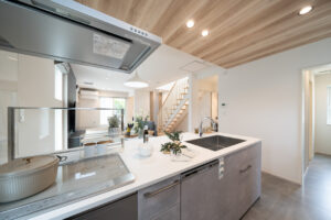ダイニングテーブルを横並びにすることで、家事動線を短縮し、料理をしながら家族との会話楽しんだり、お子様が遊んでいる風景を眺めることができる空間を実現。 -