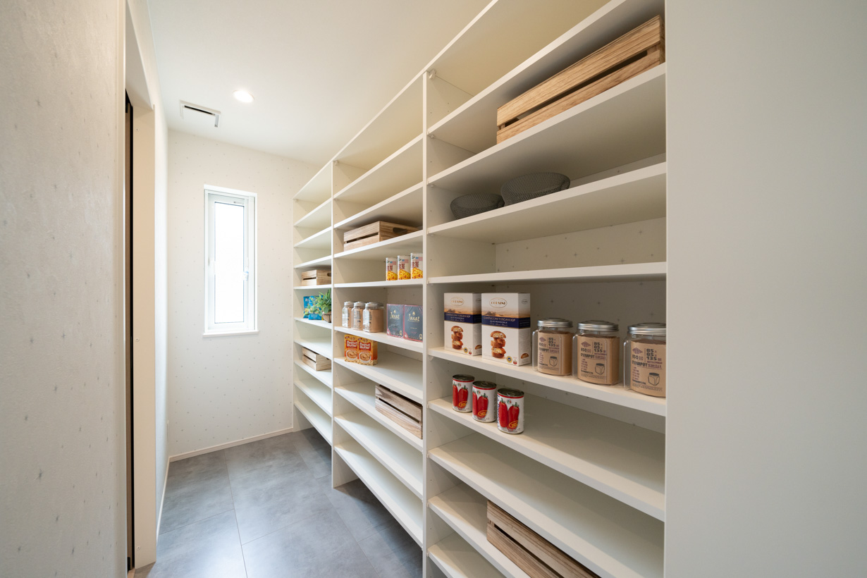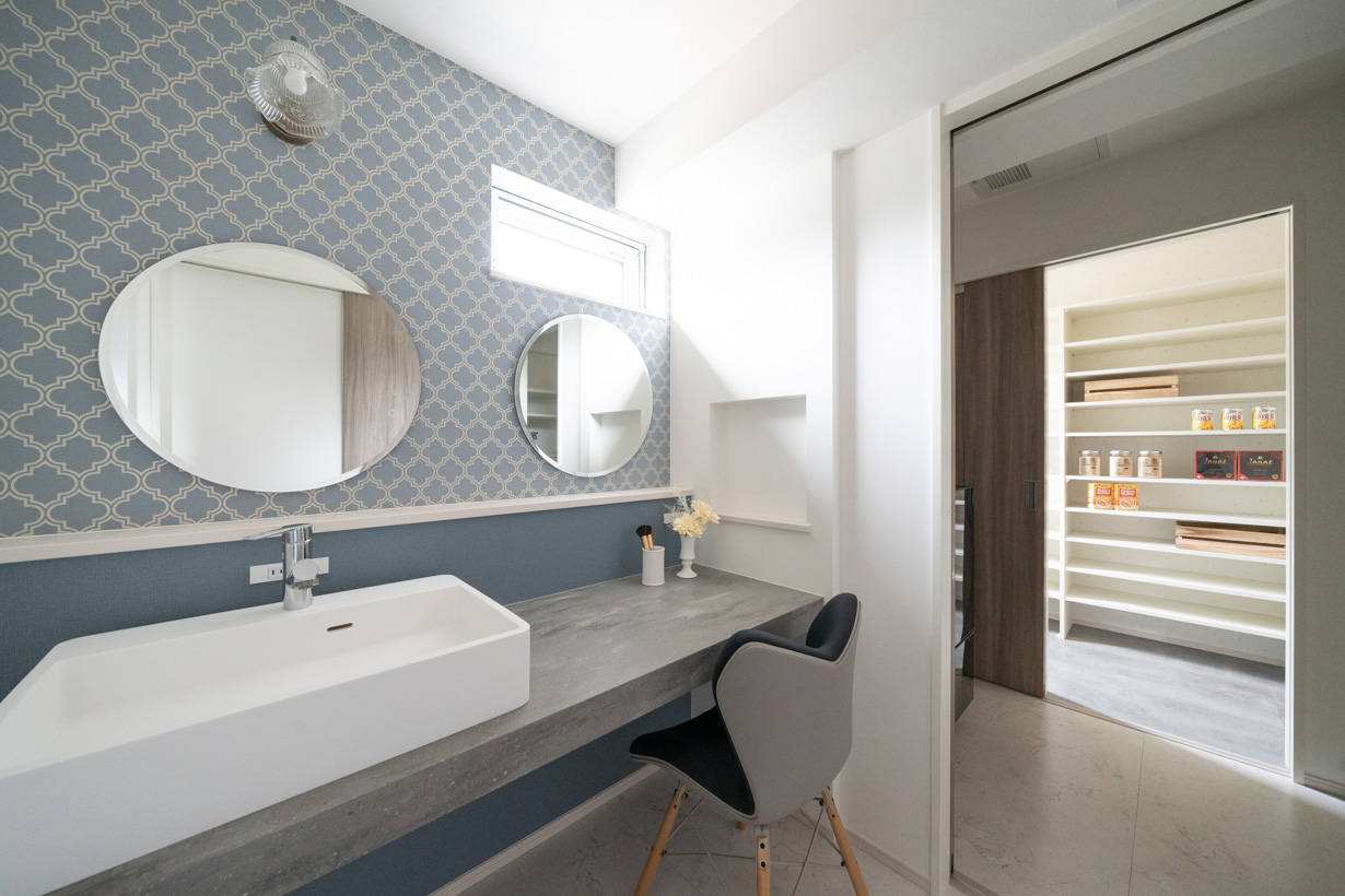 回遊動線になっており、キッチン横のパントリー、洗面室、ランドリールームがスムーズにつながり、快適な生活をサポート。