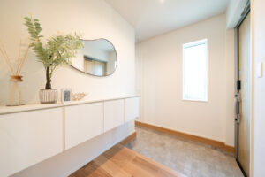 玄関から続く大容量のシューズクロークの先はキッチン、パントリーに繋がっています。お買い物後の荷物運びも楽々な動線です。