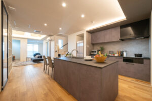 吹き抜けのある22帖のLDKは木目に黒とグレーを入れたオシャレ空間!キッチンを中心に全体を見渡せる間取りです。