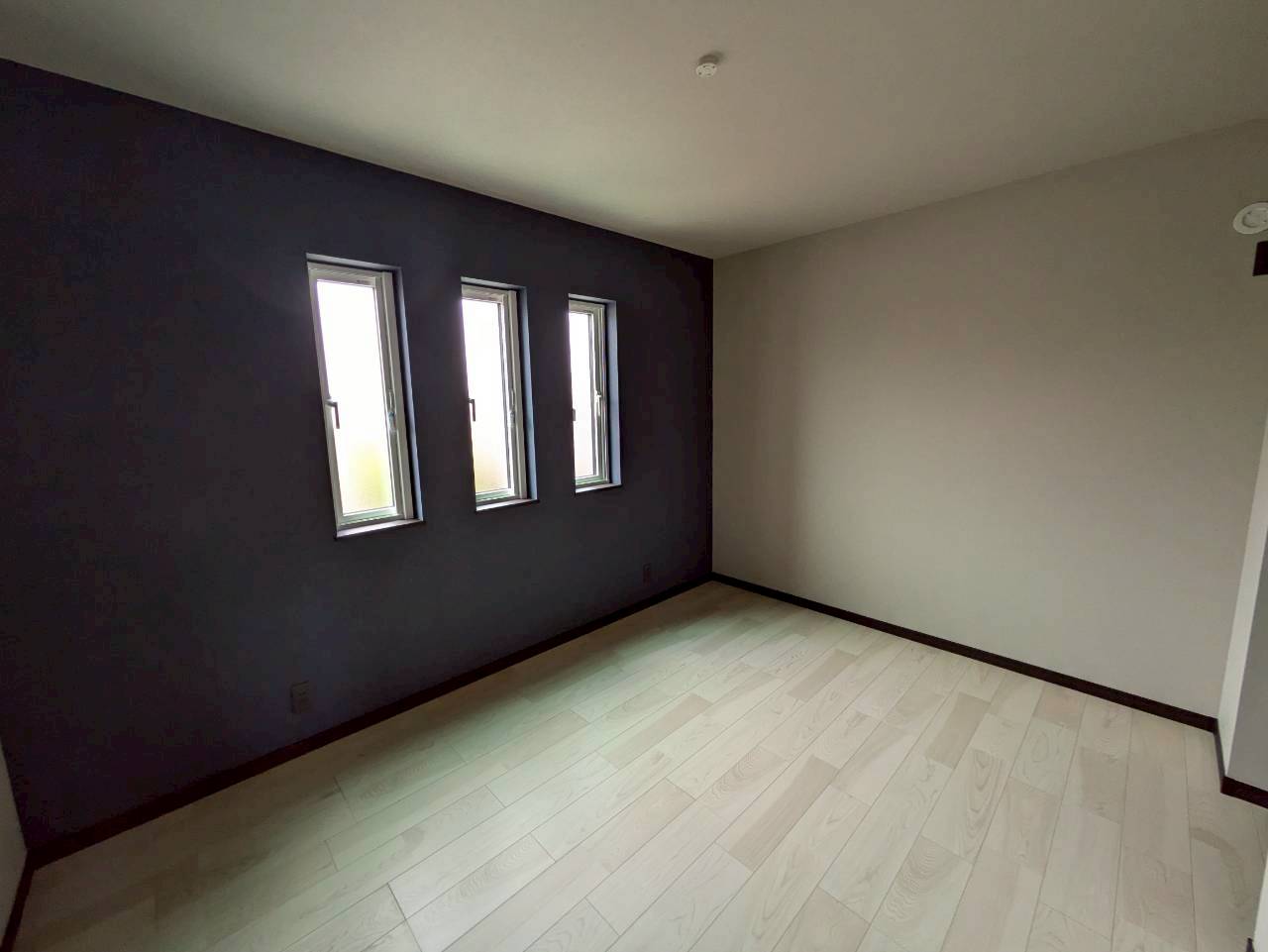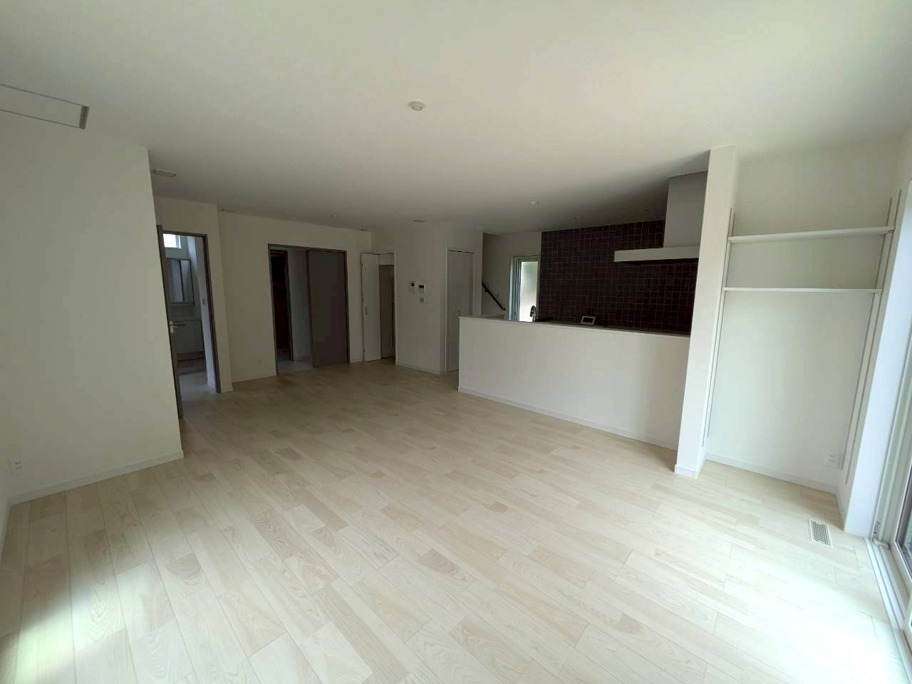 LDKはアイボリー色のフローリングが光を優しく広げ、大きな掃き出し窓と3連のFIX窓が空間に伸びやかな明るさを運びます。