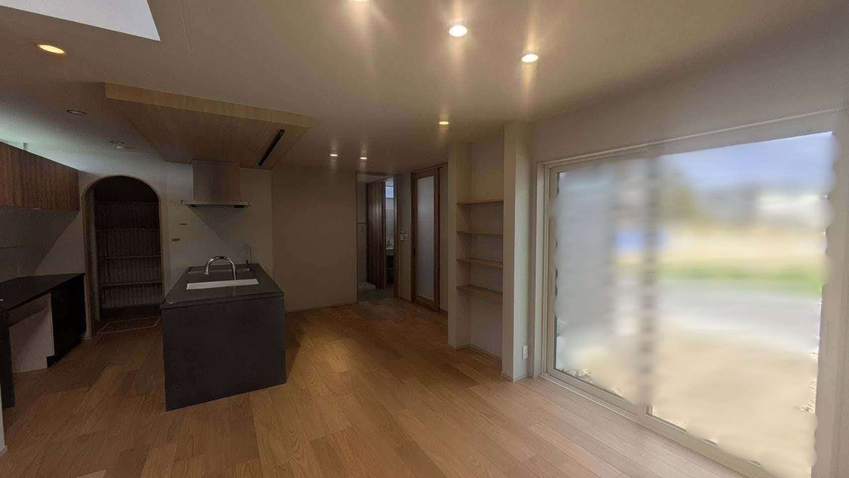 中央に配置されたキッチンからは全体が見渡せ家族の気配が感じられます。