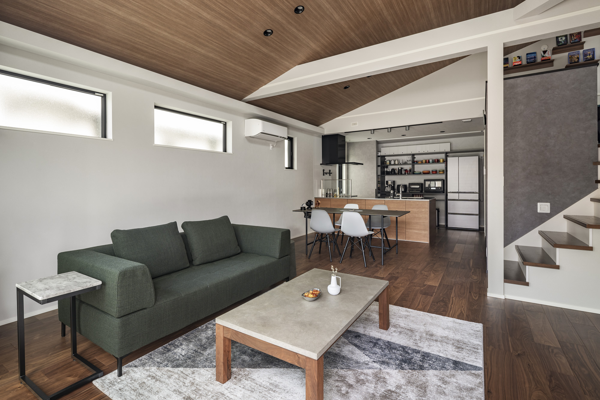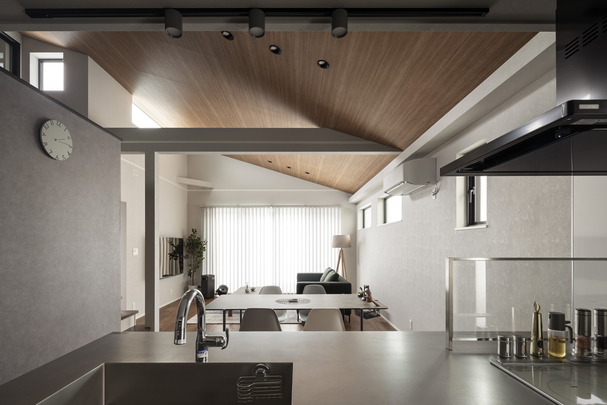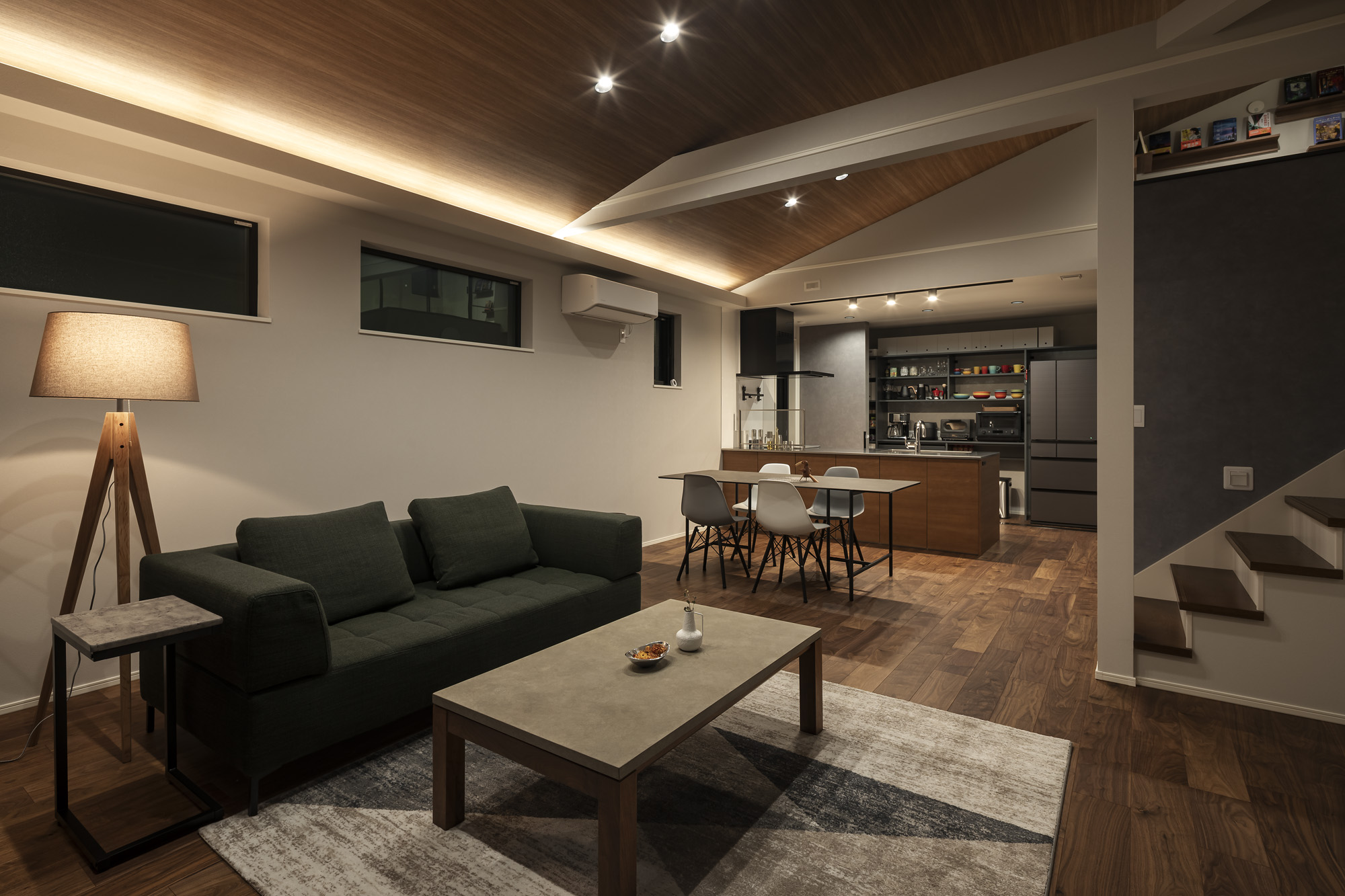 全体的に天井の高さを上げ開放感を出しながら、キッチン部分の天井を下げることでオシャレに仕上がっています。