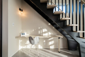 階段下収納:階段下をオープンにし、見せる収納としてお洒落度アップ!