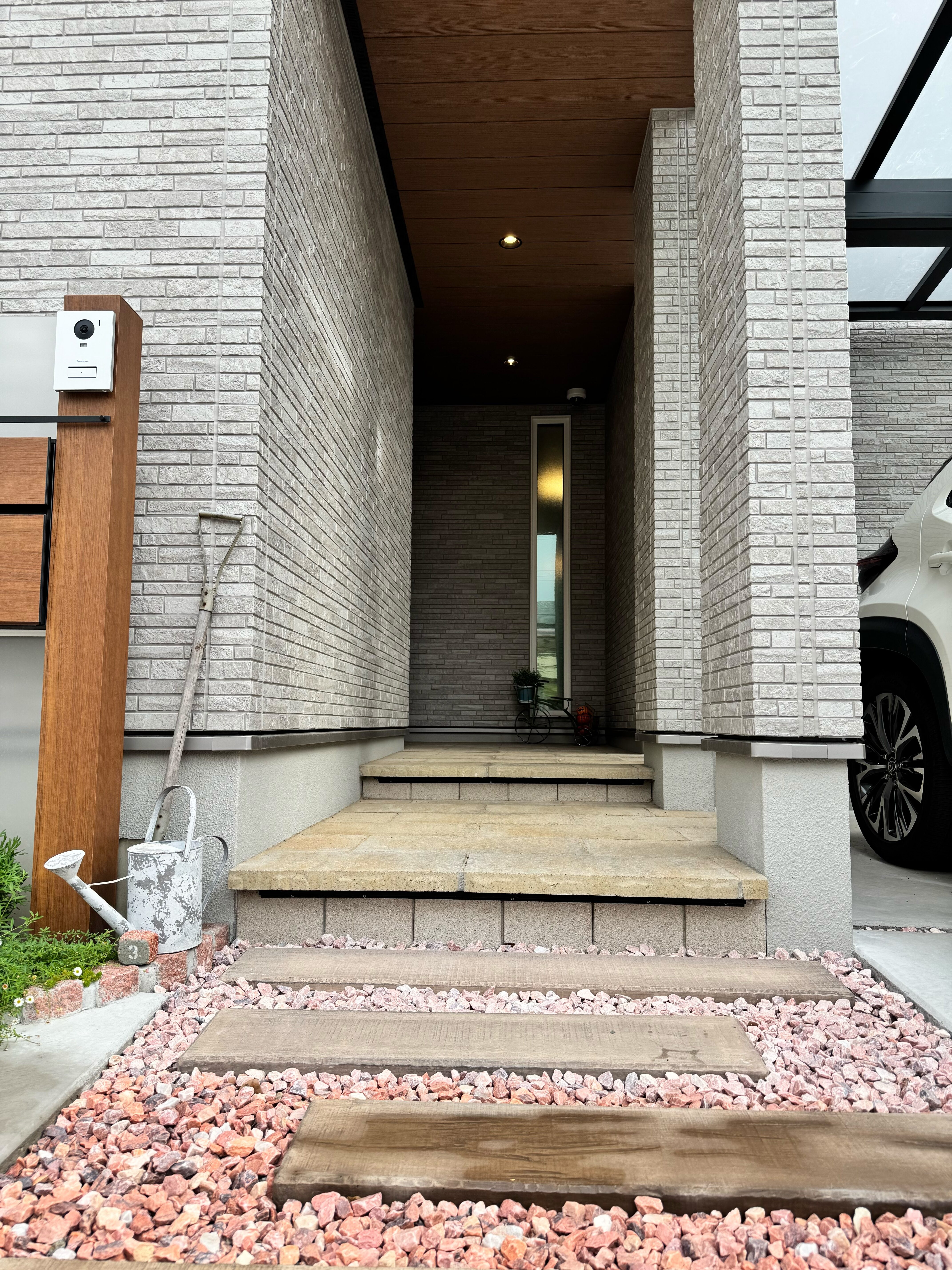 玄関前に設けられた屋根付きのスペースの玄関ポーチは、雨の日でも濡れずに鍵を開けられるだけでなく、住宅の外観をおしゃれに演出。