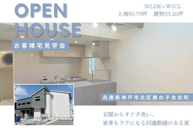 【兵庫県神戸市北区鹿の子台北町】♦約33.26坪3SLDK+WICL♦玄関からすぐ手洗い、 家事もラクになる回遊動線のある家<完全予約制お客様宅見学会>(西宮北店)