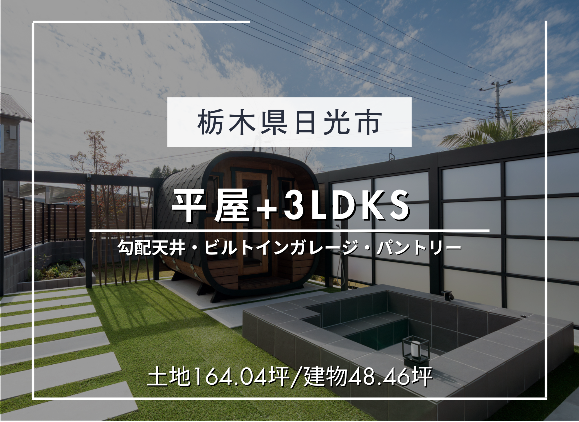【栃木県日光市】夢のサウナ付き!生活動線を考えた間取りにアイランドキッチンのある平屋〈4LDKS+ビルトインガレージ〉(宇都宮店)