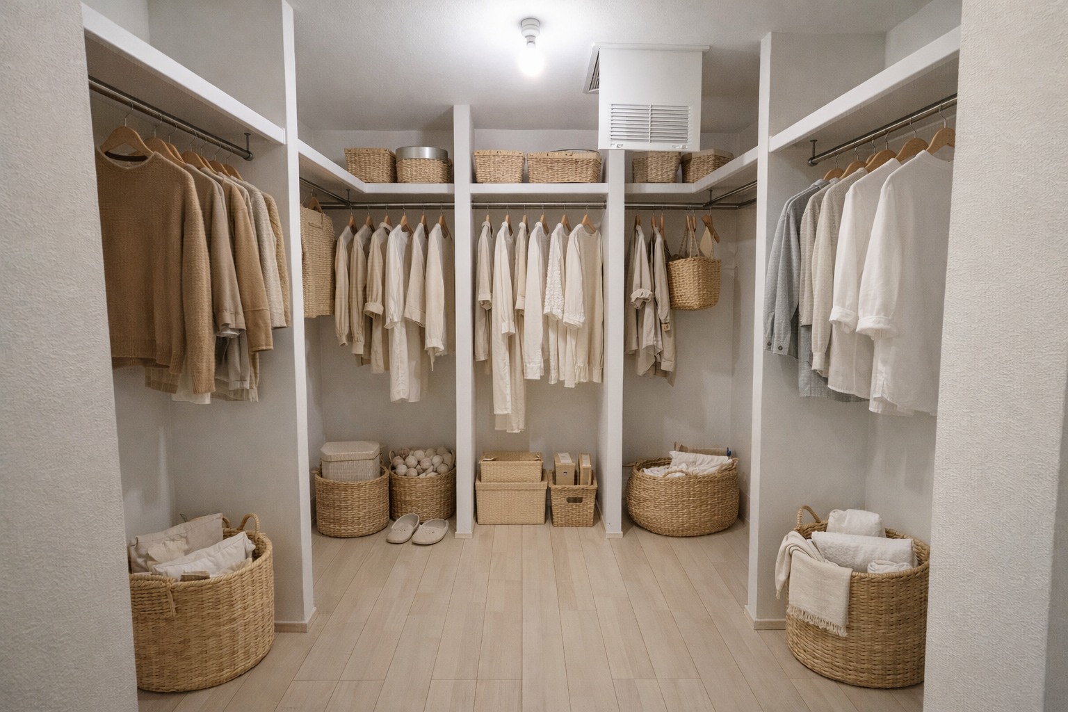 家族全員分の衣類や季節物、小物類もまとめて収納できる大容量スペースです。