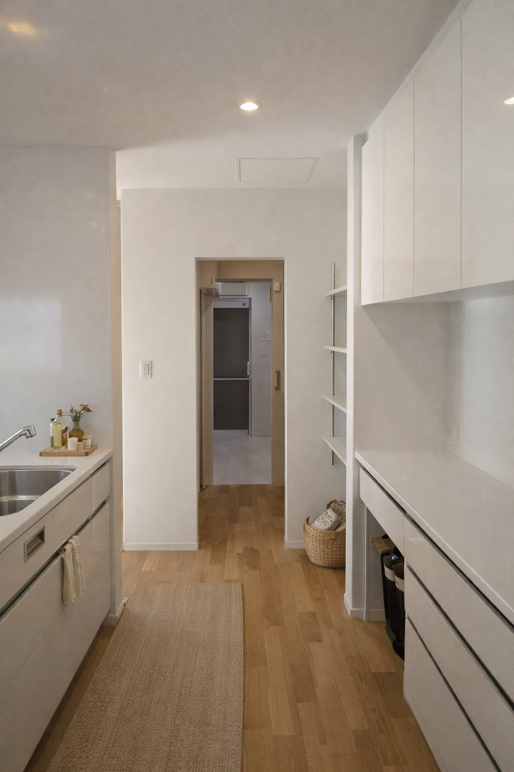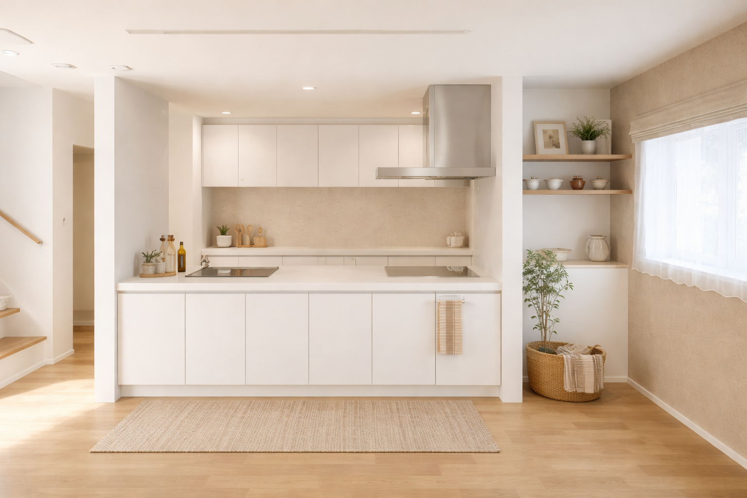 “しまう場所がある”から、リビングもキッチンもすっきりと片付き、心地よい空間に。