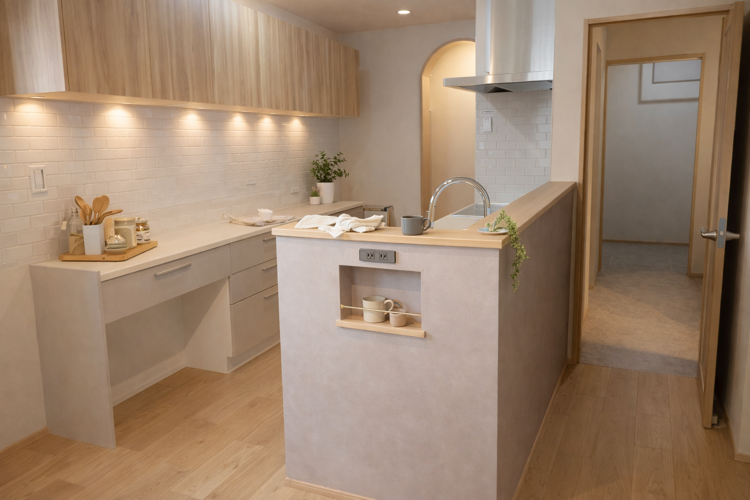 暮らしに寄り添うやさしいキッチンのあるおうちです。