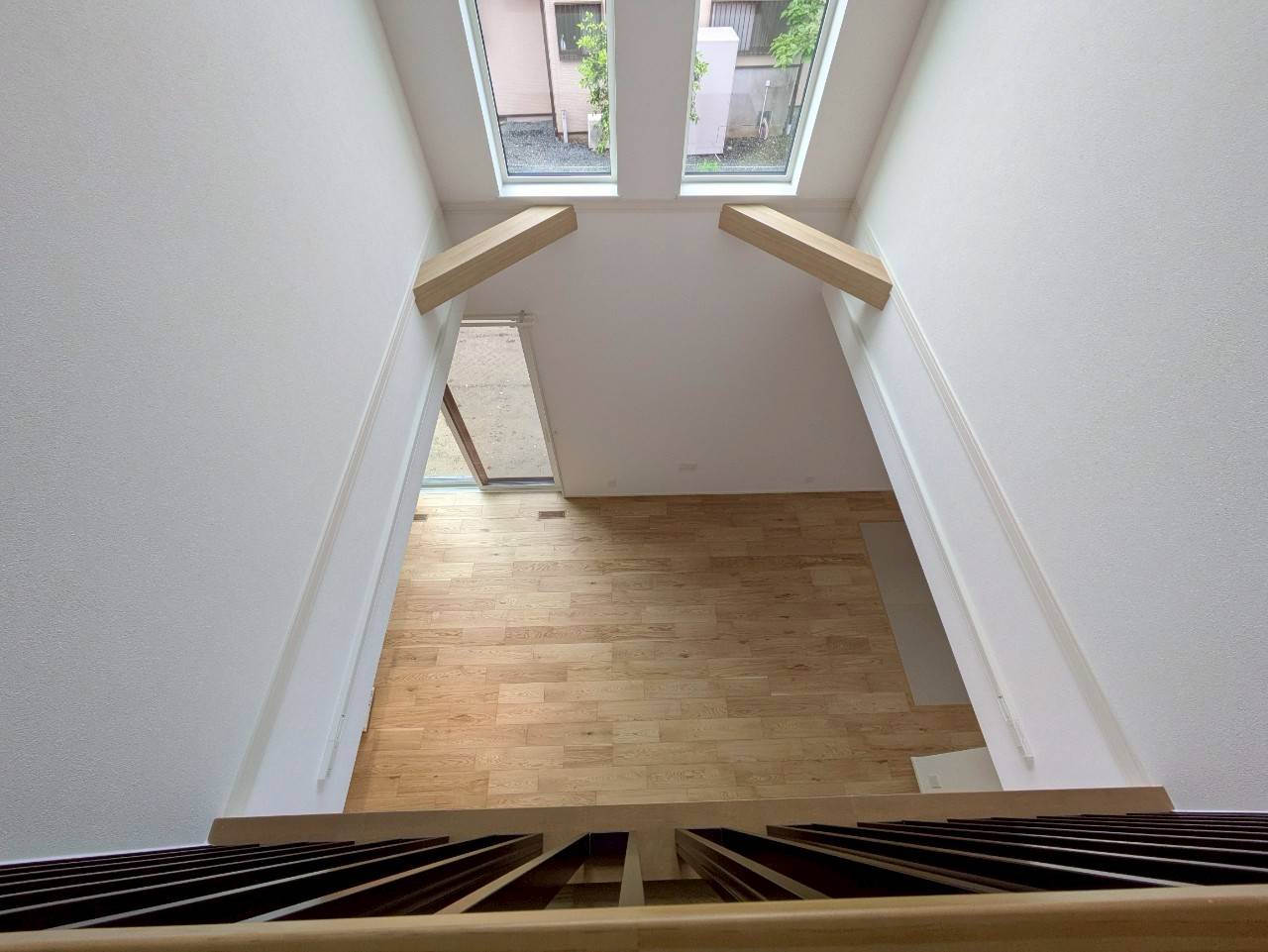 1階には17帖のLDKと、約3帖の小上がり畳スペースを配置。リビングの上には約4帖分の大きな吹き抜けが広がり、明るく開放感のある空間に。