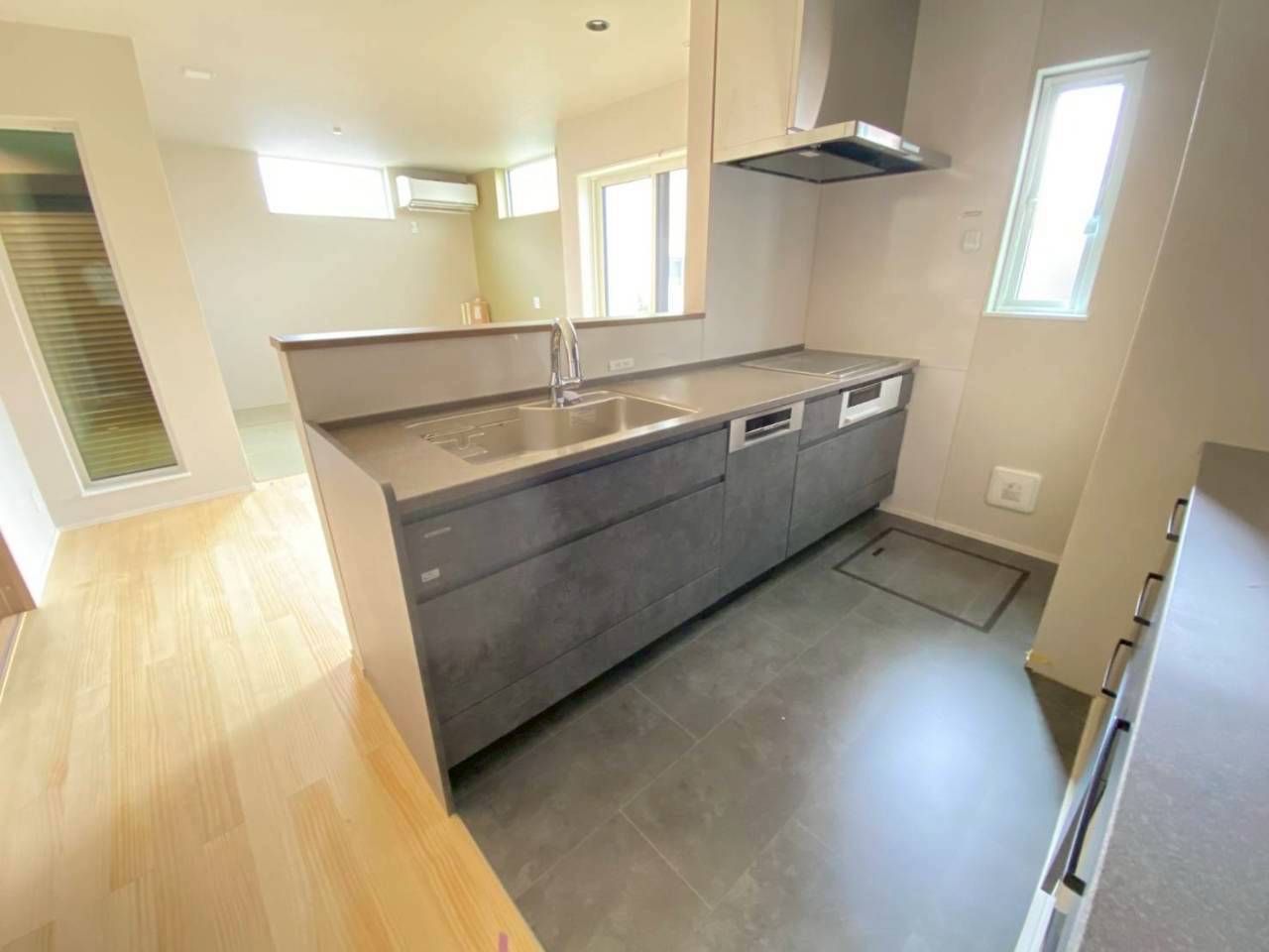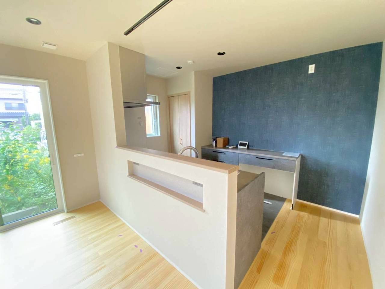 キッチンからリビング全体を見渡せる配置で、家族の会話が自然と生まれます。